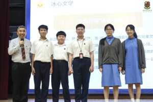 本校中文科於5月9日邀請羅凡華老師及安永軍老師蒞校,為中一級同學主持「冰心文學創作工作坊」。同學在活動中認識冰心的文學作品,並創作金句書籤。嘉賓即席挑選60份優異作品,頒發獎狀鼓勵創作,本校亦獲中國散文學會校園文學專業委員會授予「校園文學創作基地」牌匾,肯定學校推動校園文學的努力。